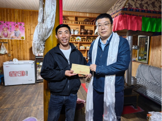 帮扶人员在驻村干部陪同下,前往脱贫户布洛家中走访慰问,代表电子科技大学后勤保障部向布洛家赠送助学金,鼓励家中孩子珍惜学习机会,勤奋读书、健康成长,未来能以所学所长为社会主义现代化建设、为家乡振兴贡献力量。