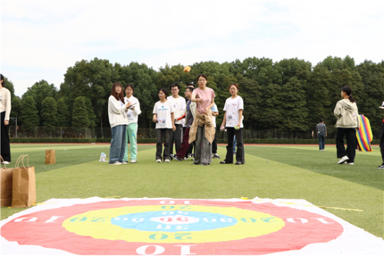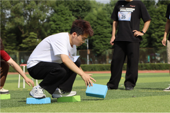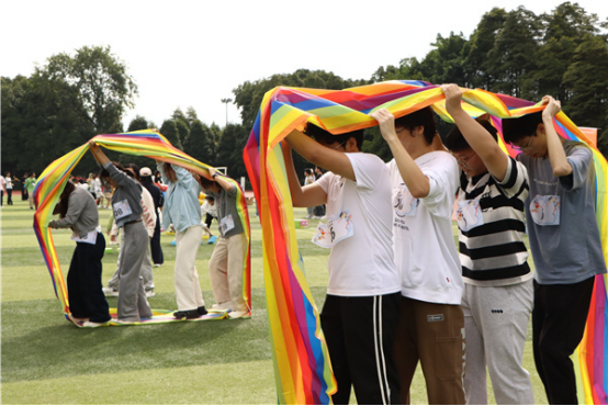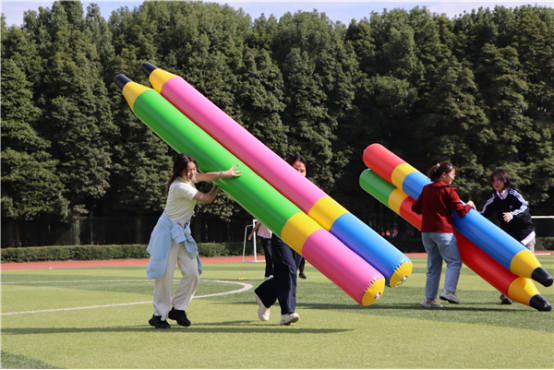 本次运动会设置了六大趣味竞赛项目。在“沙包投掷障碍赛”中,队员们屏息凝神,瞄准靶盘;“车轮滚滚”需要四人步伐高度同步,喊着整齐口号稳步向前;“摸石头过河”考验队员们的平衡与接力配合;“彩虹飞舞”则展现了各队的创意与协作;“快乐铅笔”项目要求团队精准控制巨型铅笔的滚动方向;而“不倒森林”更是将现场气氛推向高潮,八人围圈扶立杆,极致的专注与同步成为制胜关键。