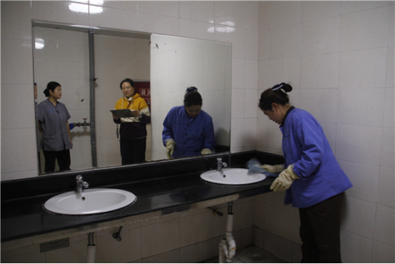 考核在早晨日常保洁工作刚刚结束后随即展开,真实检验了保洁工作的日常水平。各检查小组严格依据《保洁质量考核方案》及评分细则,对清洁工具摆放、区域卫生状况、操作规范等近二十个细节项目进行考核评分。考核结束,保洁员当场签字确认考核结果。