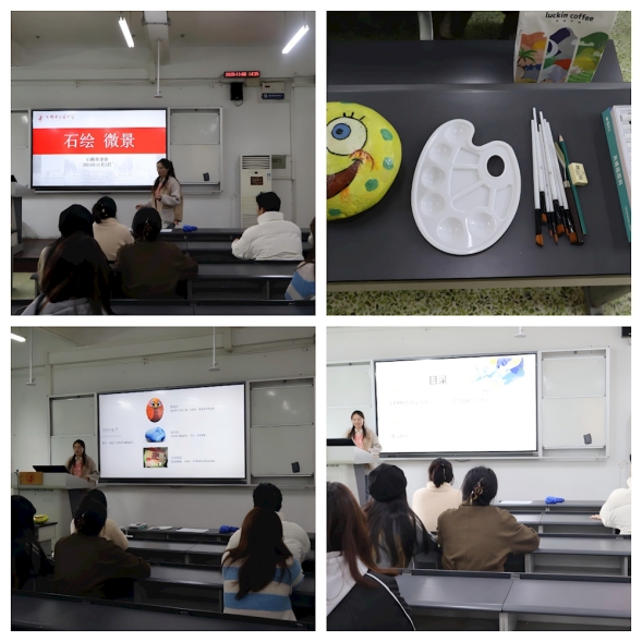 读书廊下,石头做纸,颜料做笔。首场教学从“选石、调色、打底”开始,同学们完成第一块“微景原石”,文化劳育悄然浸润。