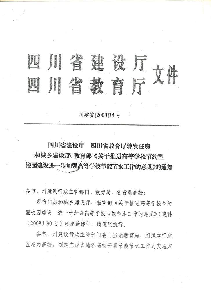 四川省建设厅 四川省教育厅转发住房和城乡建设部 教育部《关于推进高等学校节约型校园建设进一步加强高等学校节能节水工作的意见》的通知(川建发【2008】34号)