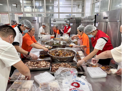 当日早上7点,后勤基建处饮食服务中心全体工作人员投入盒饭的备餐工作中,从食材的严格清洗、切配,到菜品的精心烹饪、分装,以及高效组织配送工作,最终将1100余份营养均衡、热气腾腾的盒饭快餐准时送达指定地点。